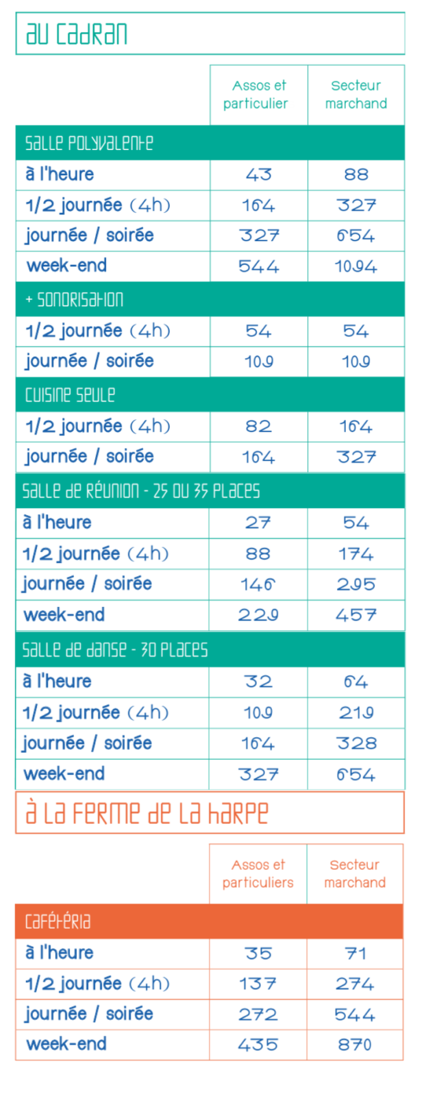 - Une salle chaleureuse et conviviale de 50 places à la Ferme de la Harpe, équipée d’un petit coin cuisine, à proximité immédiate de beaux espaces verts.